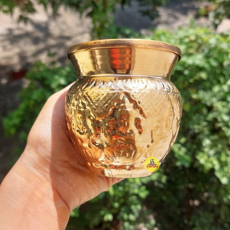 The vessel is typically designed with a spout or pouring mechanism, making it easy to distribute the holy water during ceremonies. It plays a crucial role in various rites, including daily worship and special religious events, where it is used to offer water to deities, participants, or objects, symbolizing purification and blessings.