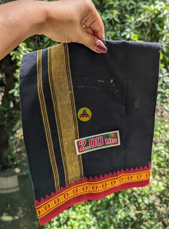 This 2-meter veshti with a border is a traditional garment worn by men, especially in South India. The veshti is a long piece of unstitched fabric that is wrapped around the waist, often worn during religious ceremonies, festivals, and formal occasions